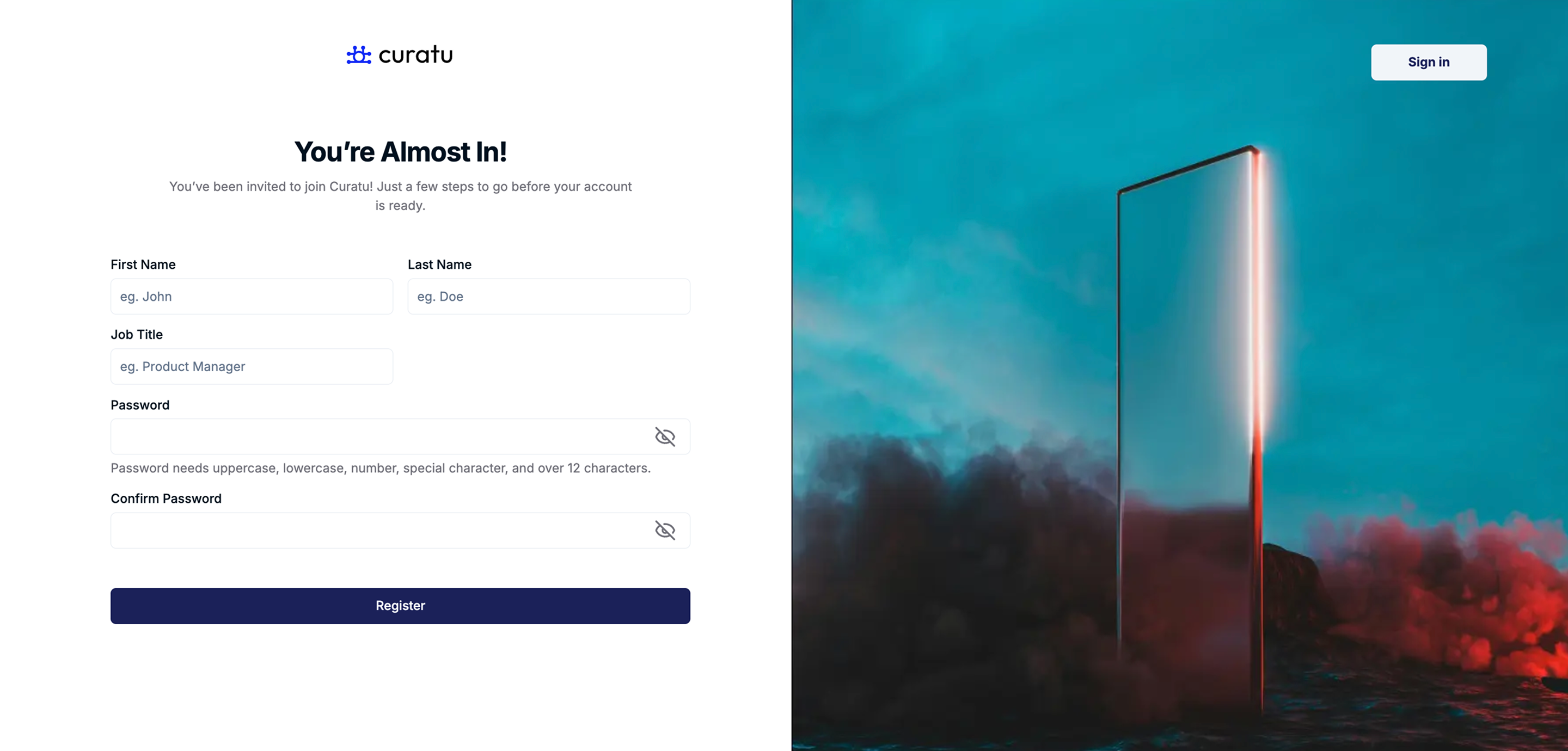 When an invited team member clicks the invitation link sent via email, they’re redirected to a registration screen to complete their onboarding.
