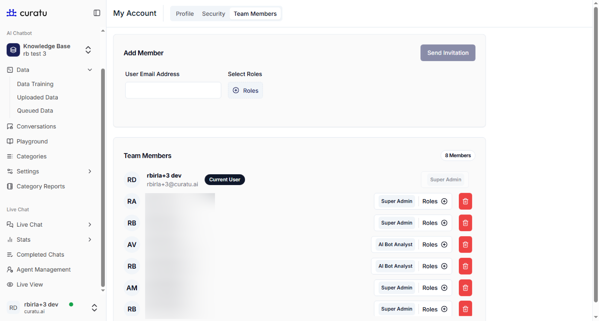 The Team Members tab allows you to manage your support and admin users. You can invite new members, assign roles, and view or remove existing members.