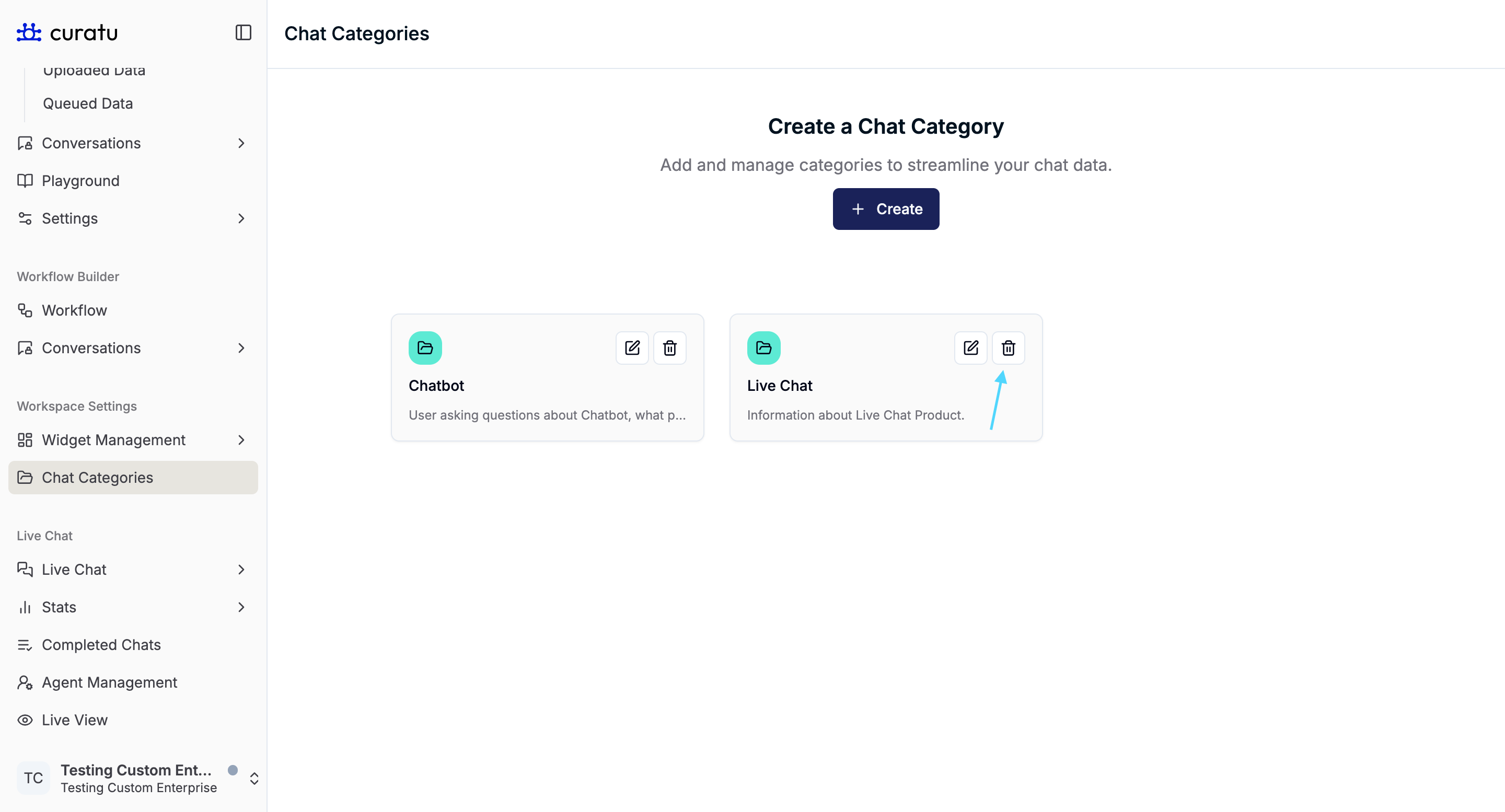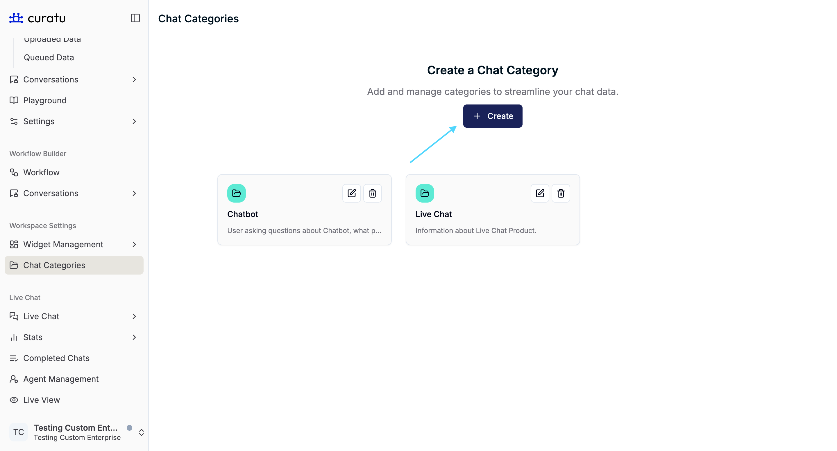 You will land on the Create a Chat Category screen, where existing categories are displayed as cards.