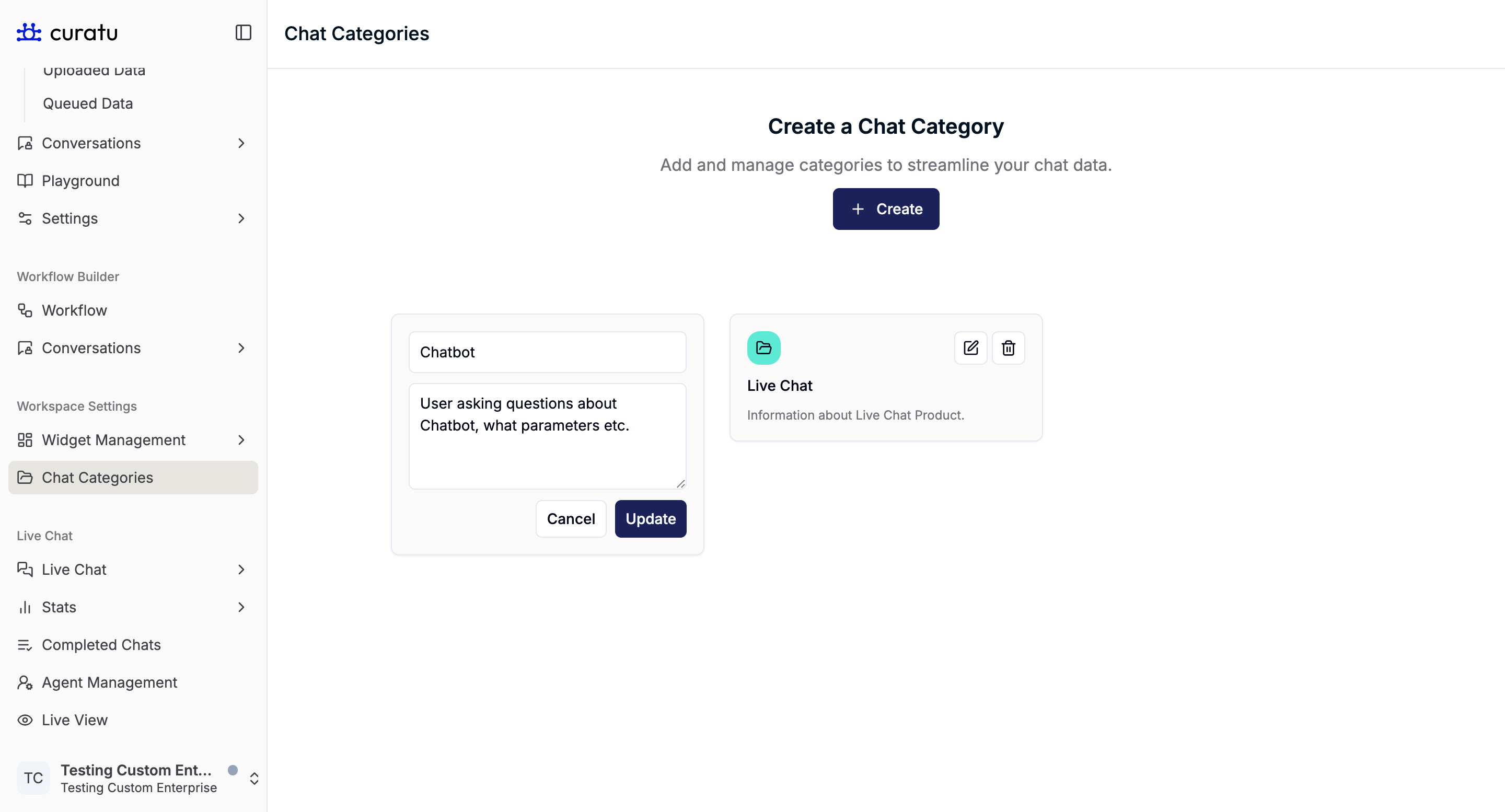 The Chat Categories feature allows you to create, edit, and manage categories used to organize and classify chat conversations.