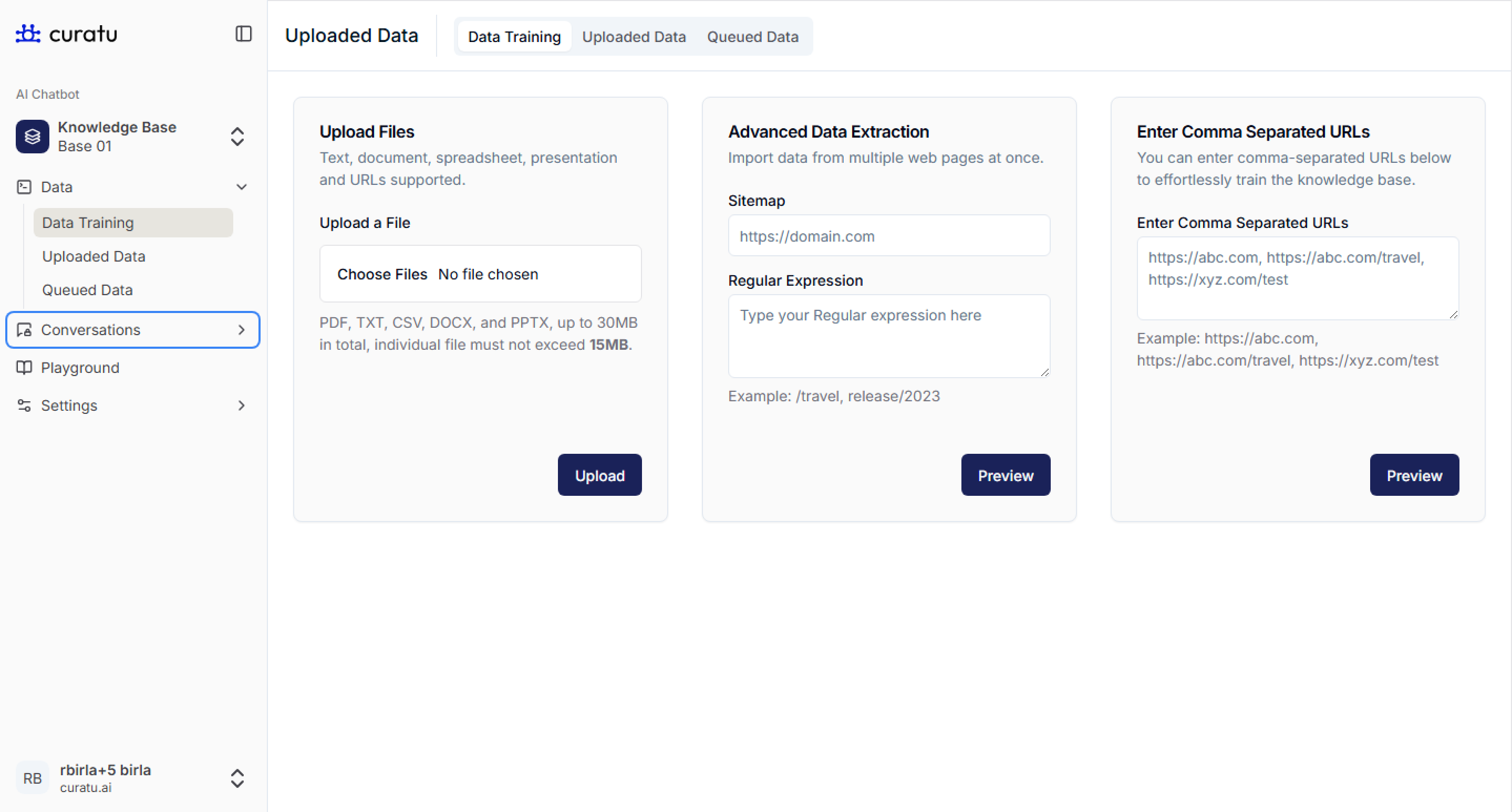 • You can upload multiple files or use URLs/regex for data training if needed