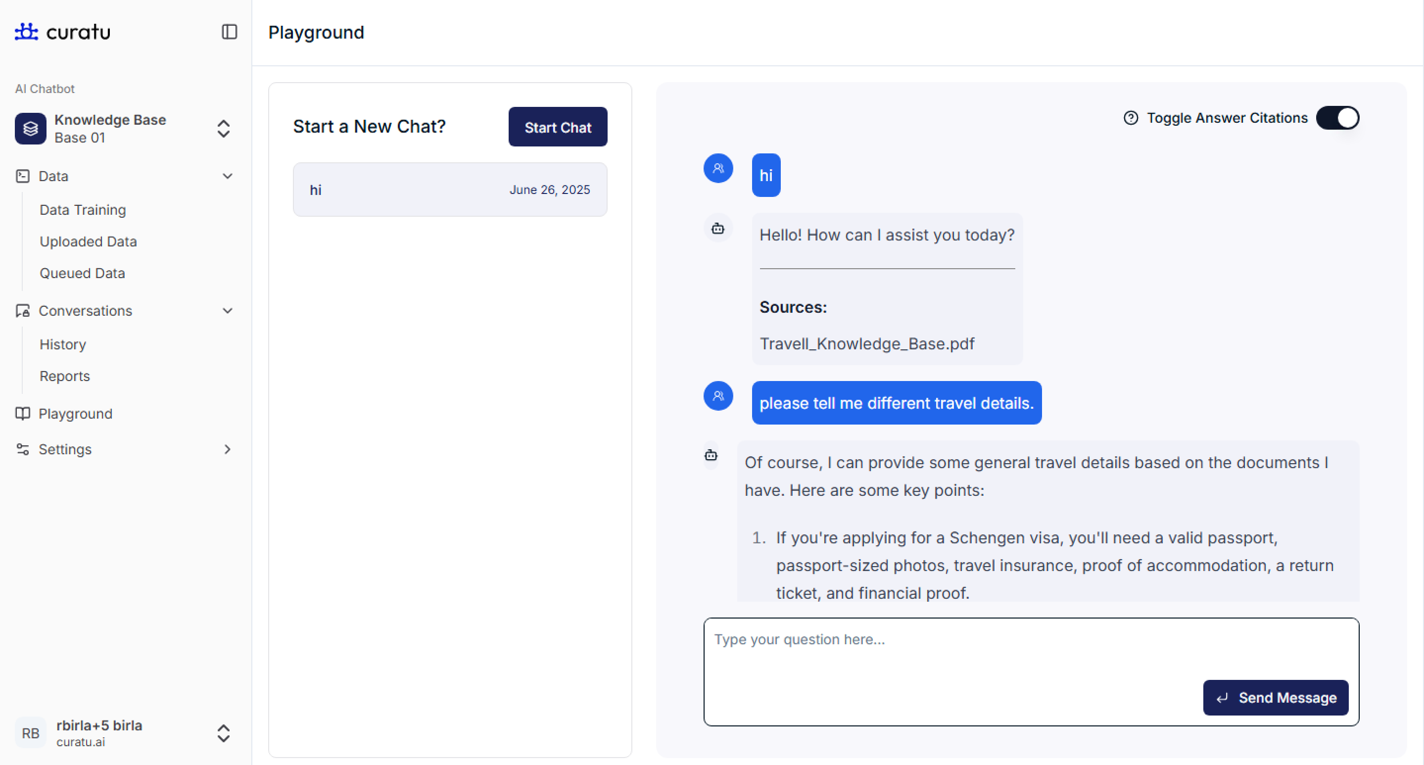 Your Travel Knowledge Base is now live, trained, and ready to respond to travel-related queries in the Playground. You’ve successfully completed setup and testing!
