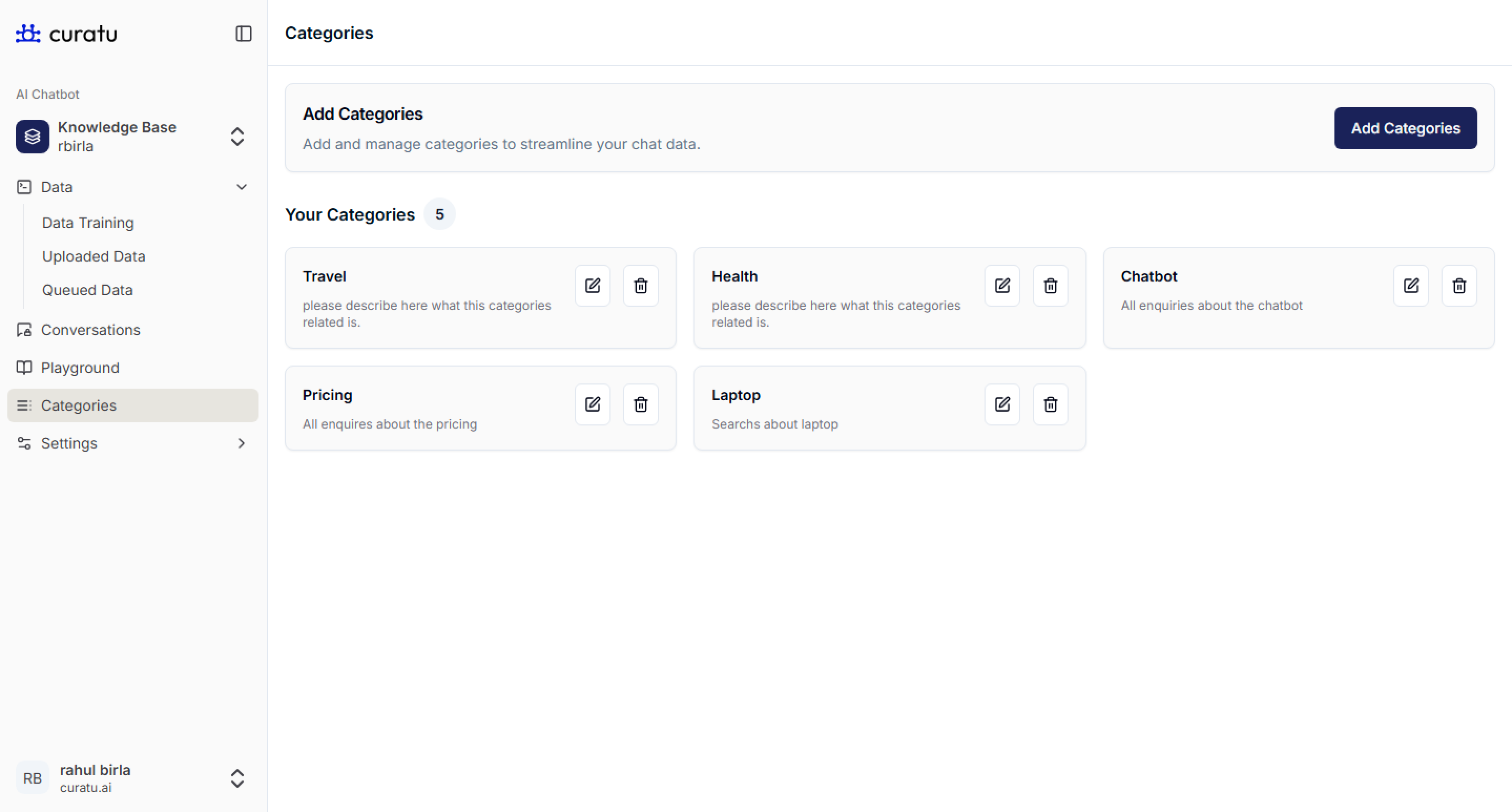 Use categories to keep your chatbot organized, focused, and easy to manage — especially as your bot grows with more data and user interactions.