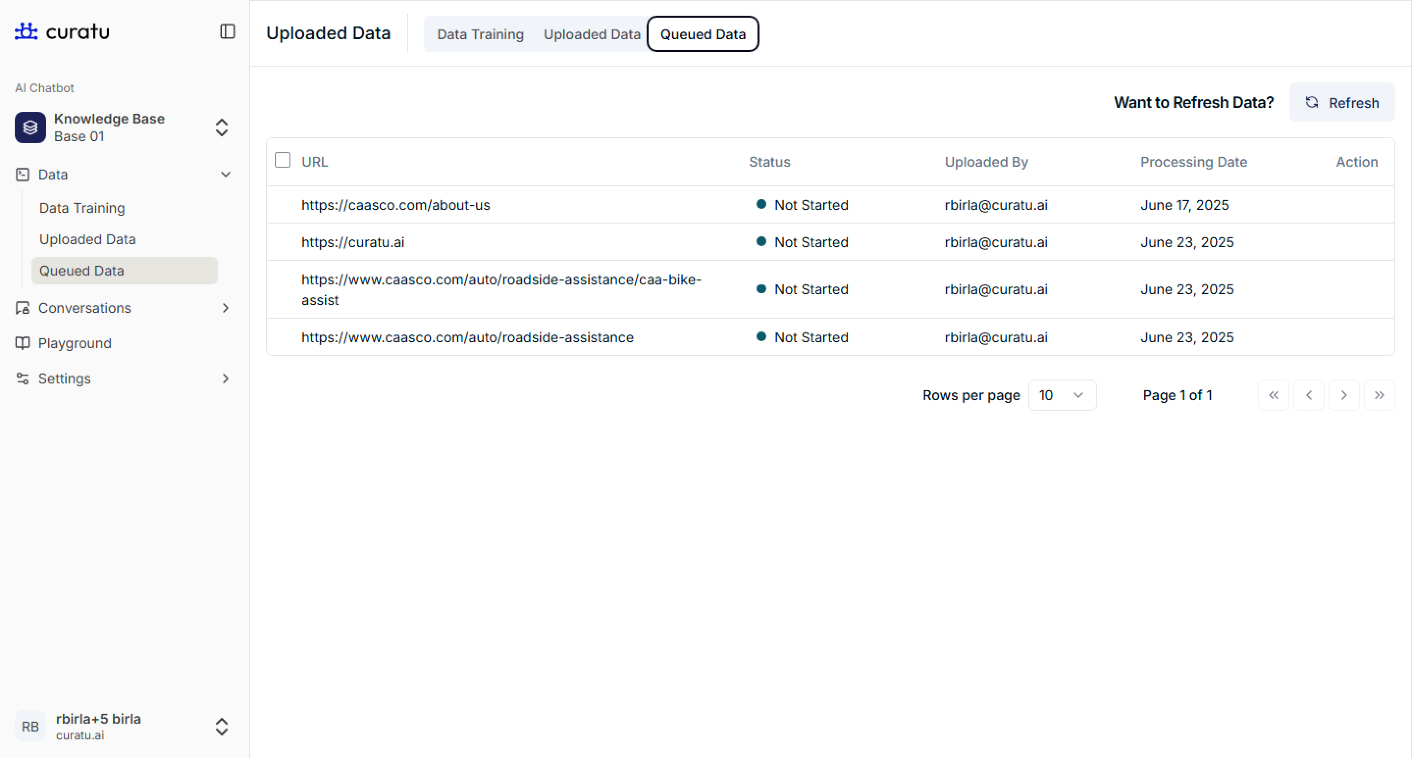 - Only successfully trained URLs move to the Uploaded Data tab.