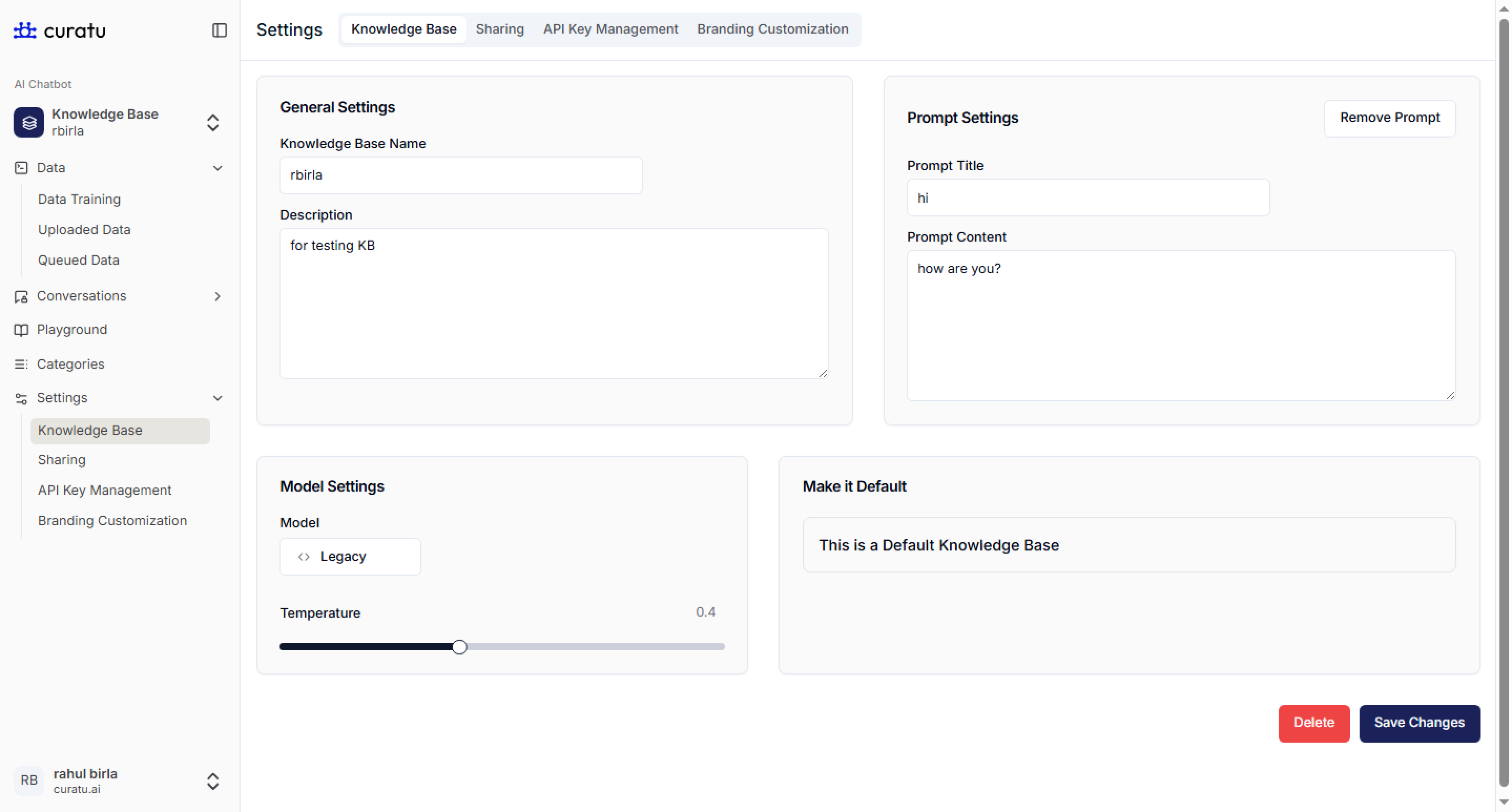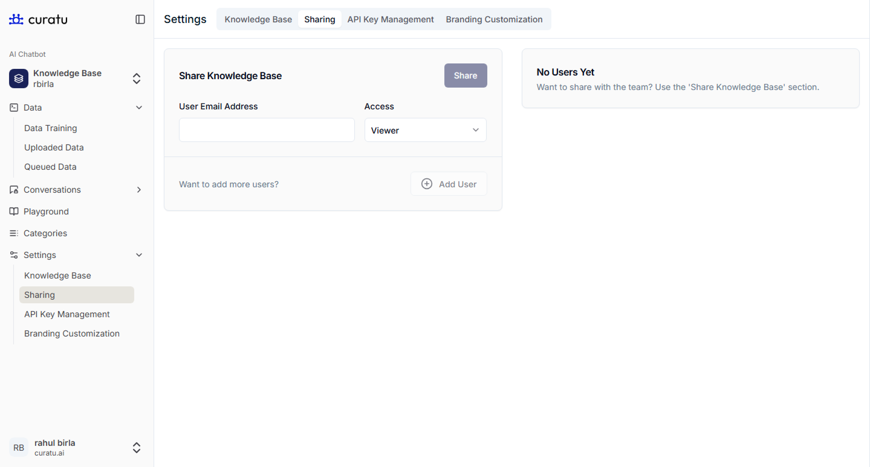 The Settings section allows you to configure and manage your knowledge base, user access, chatbot embedding, and branding. Below is a detailed explanation of each tab inside Settings: