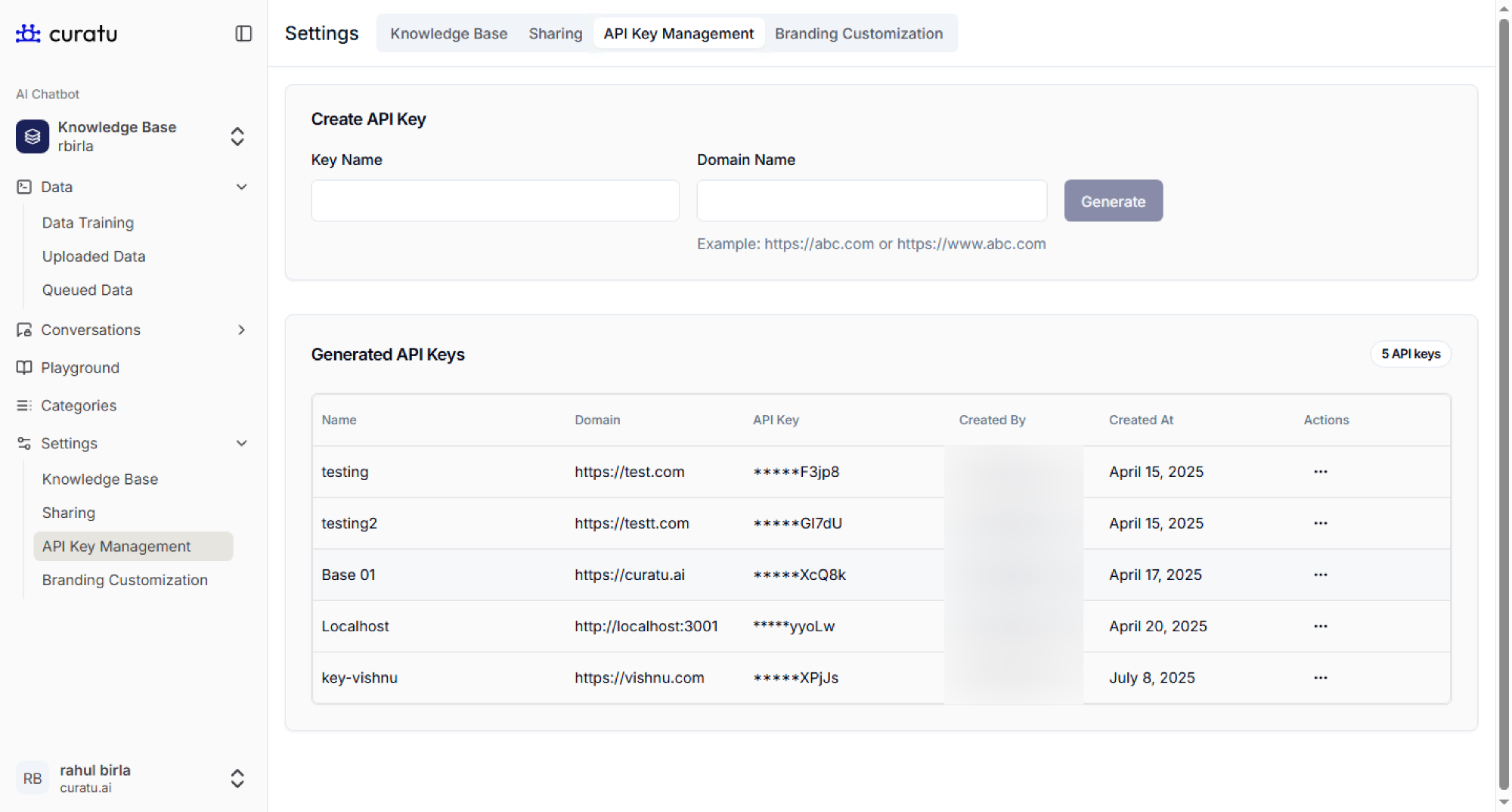This tab allows you to generate API keys to integrate your knowledge base into external websites.