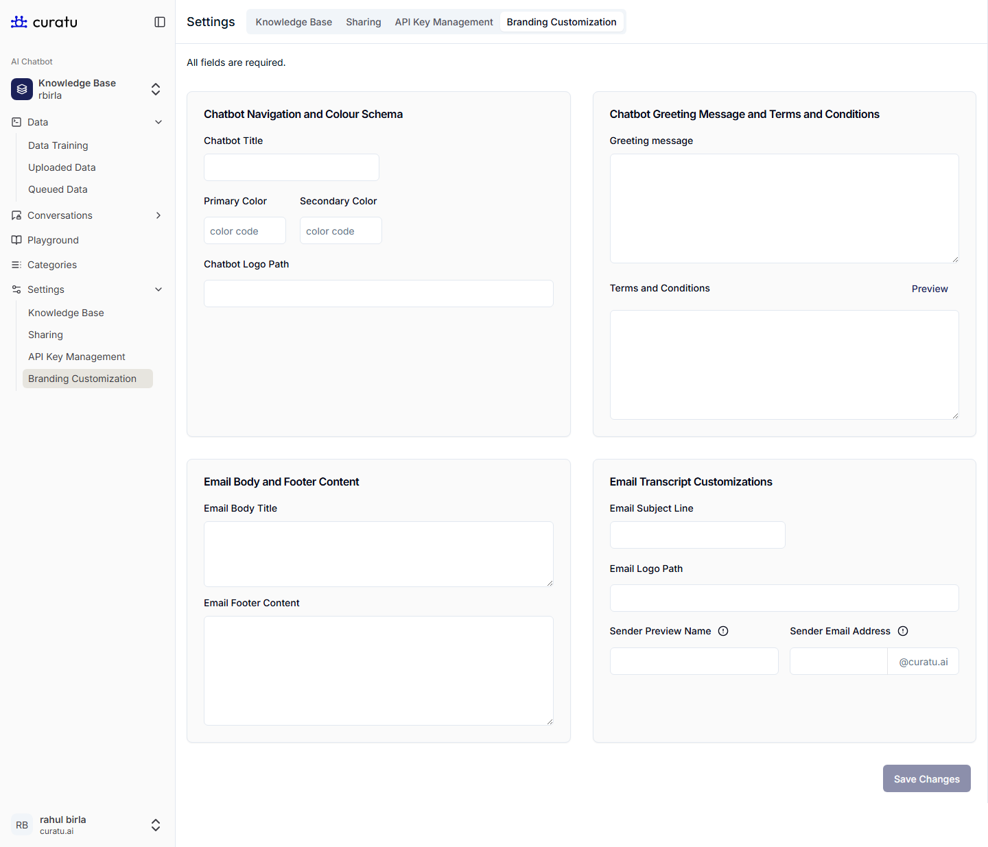 The Branding Customization tab allows you to personalize the look and feel of the chatbot and emails it sends. This helps align the chatbot interface and communications with your company’s brand identity.