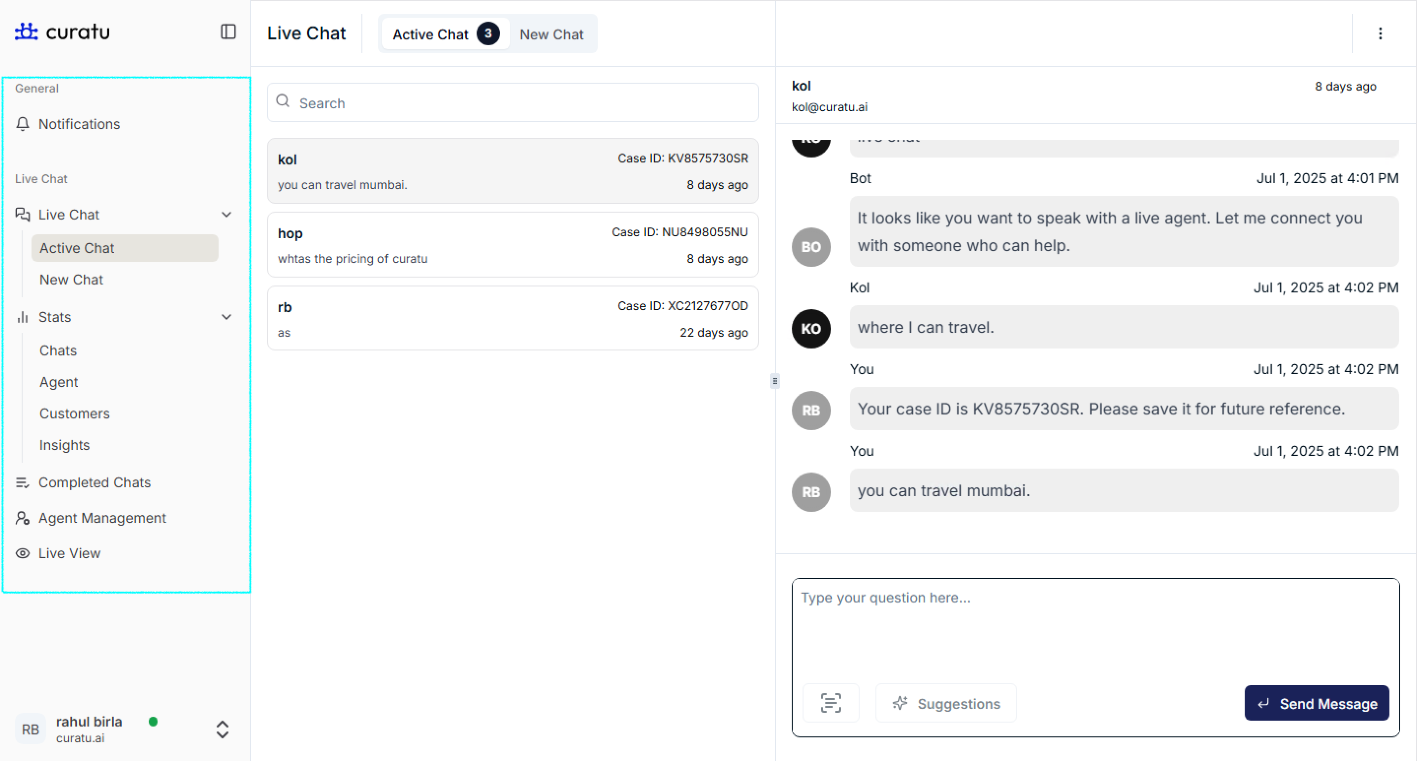See how each agent is performing — including chat count, resolution rate, and average time spent per user.