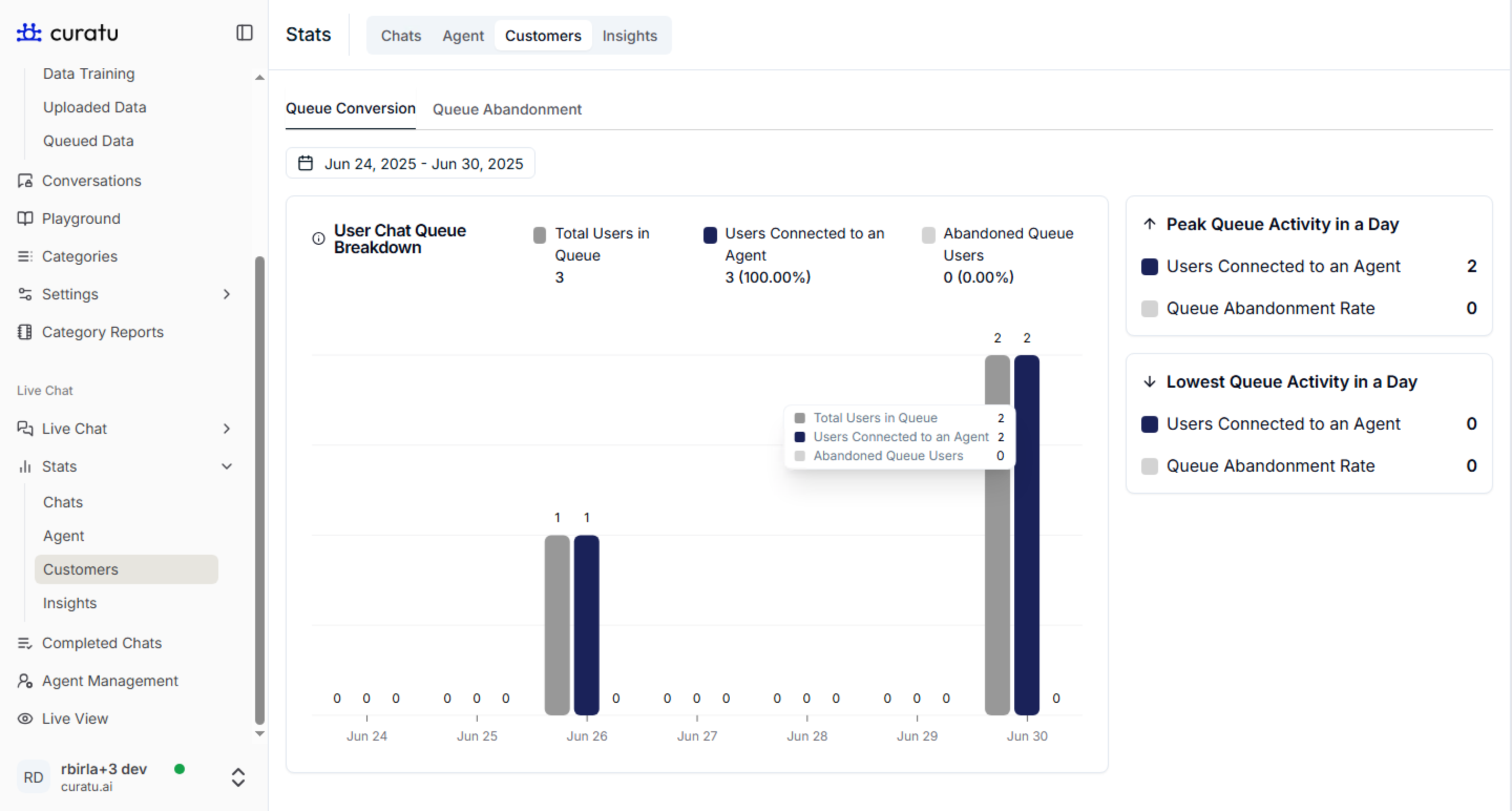 The Customer Stats section provides visibility into how users interact with your live chat system, focusing on how effectively your agents handle incoming queries and how many users abandon the queue without getting help.