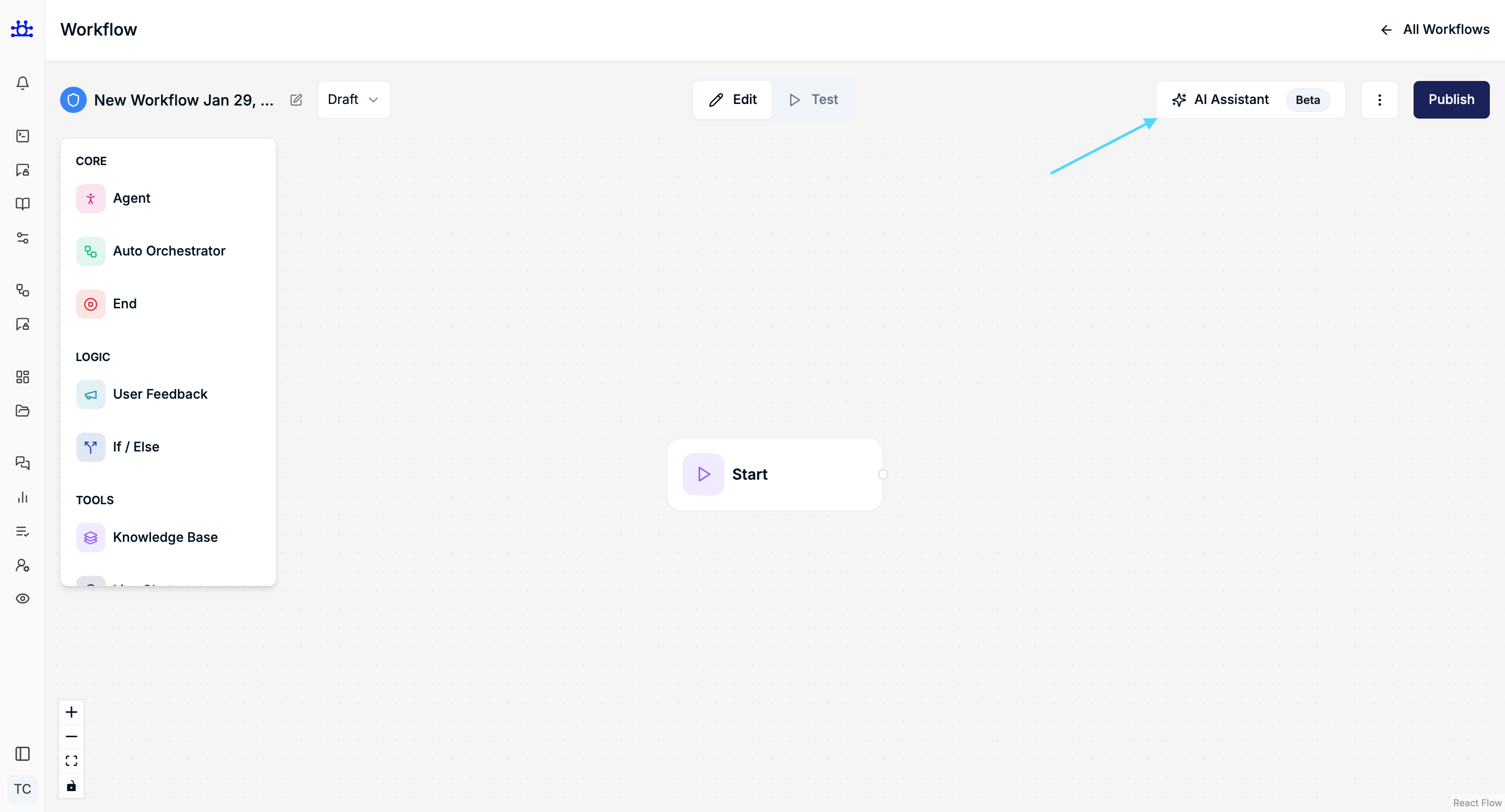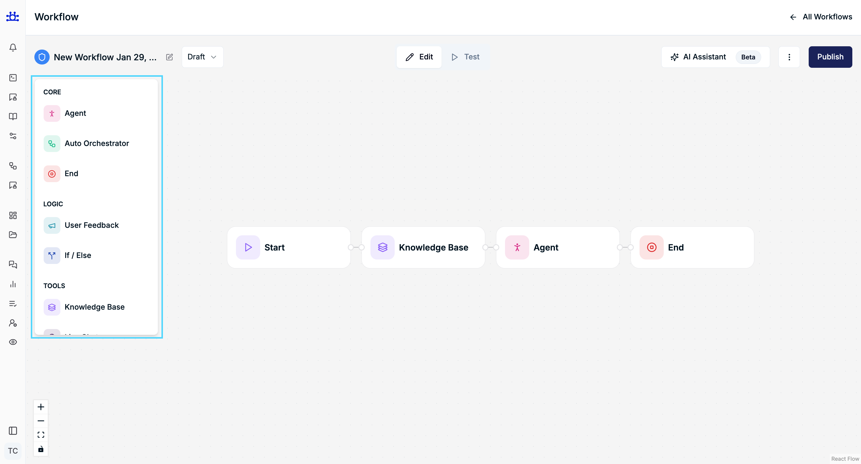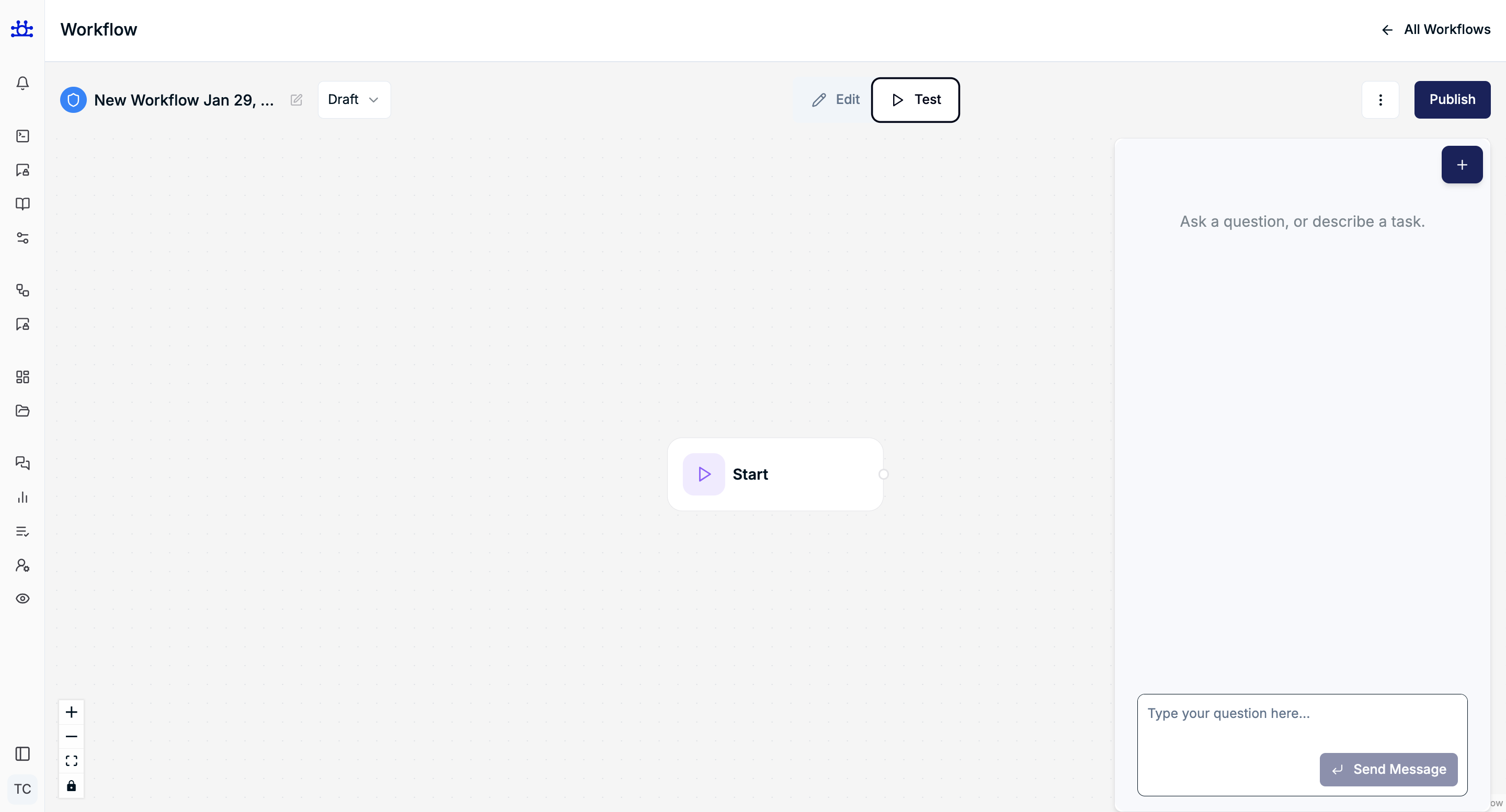 The Workflow Builder allows you to create, manage, test, publish, and collaborate on automated chatbot workflows using a visual canvas.