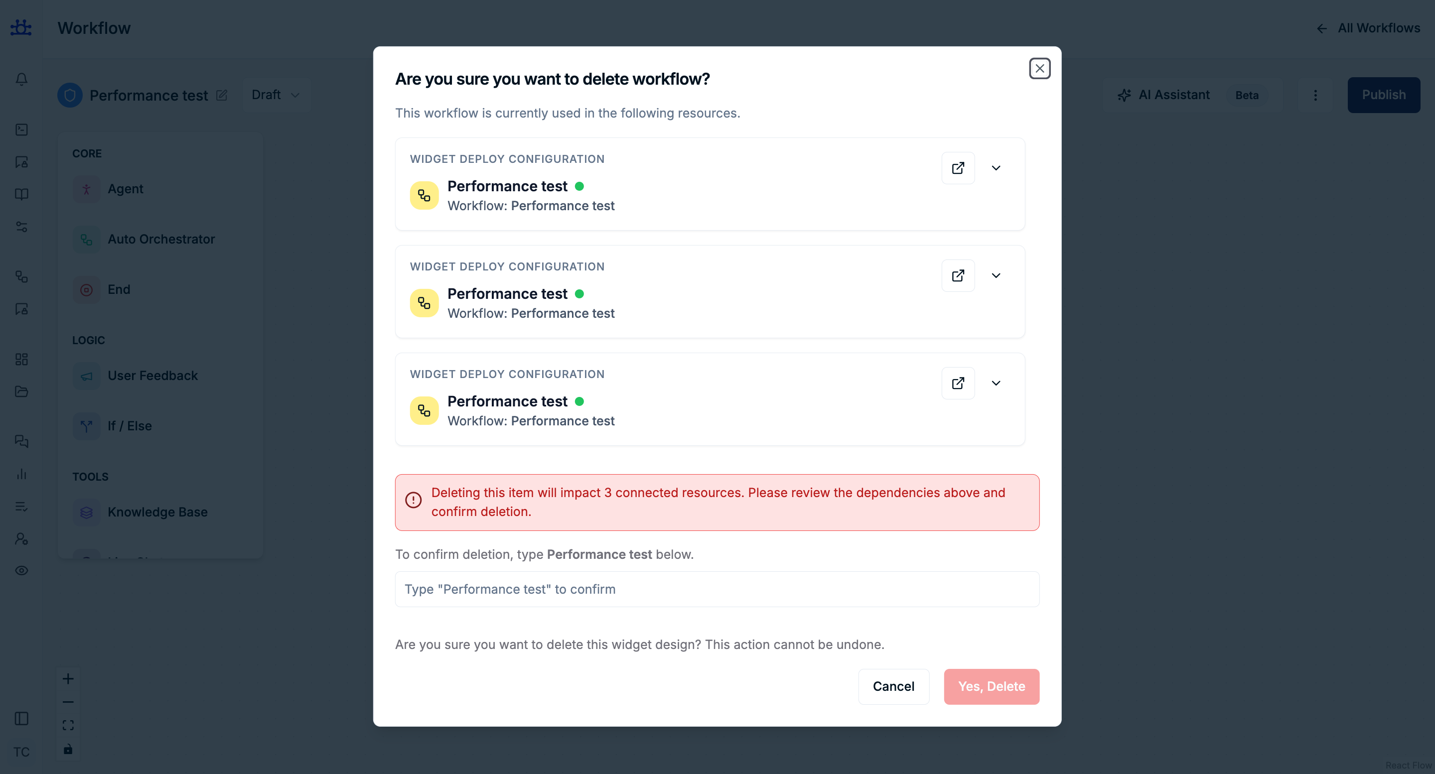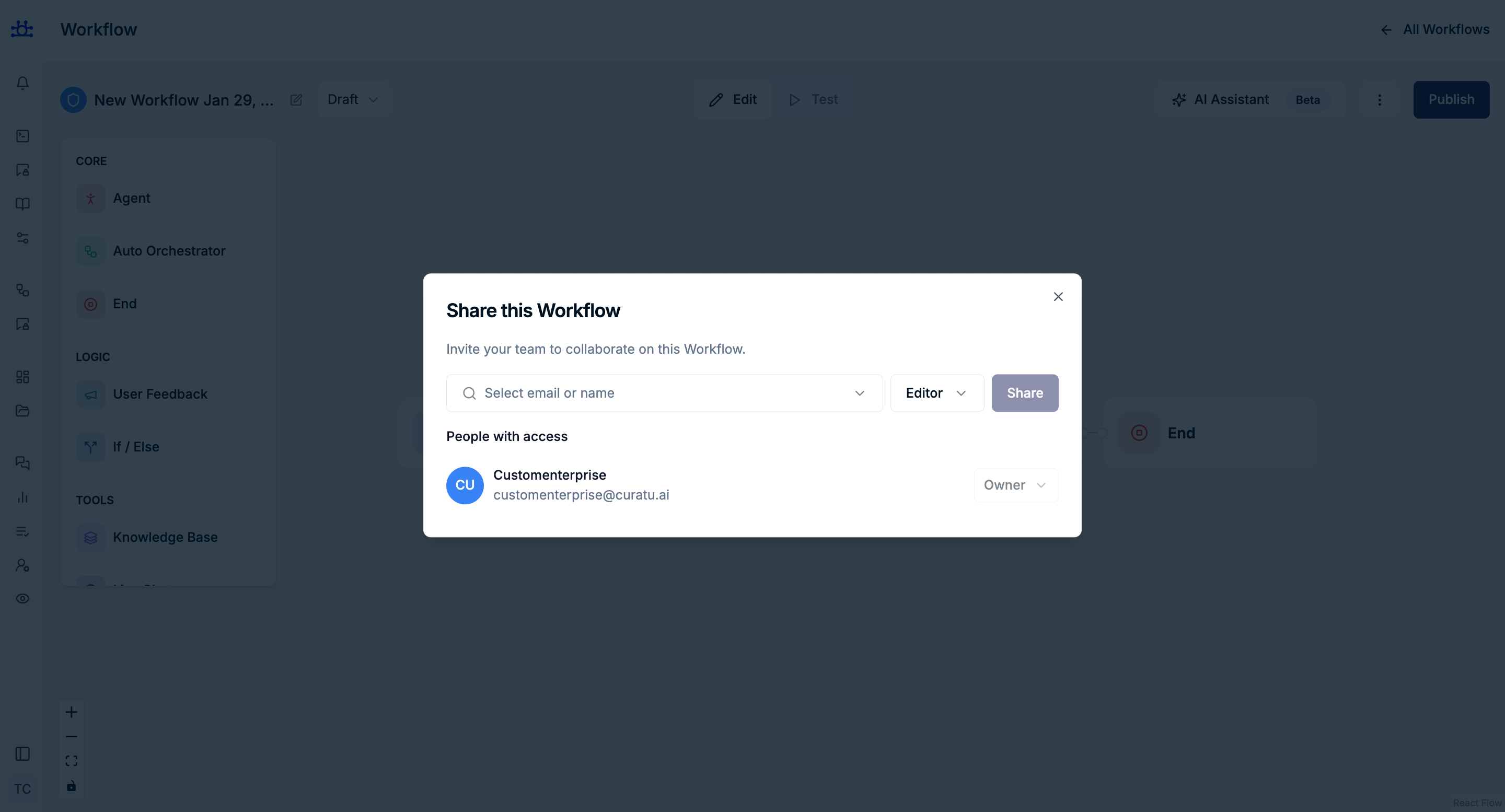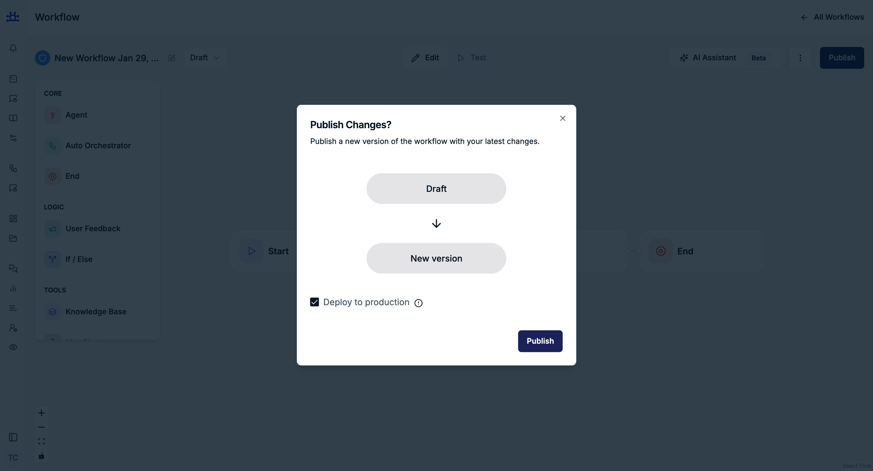 The Workflow Builder allows you to create, manage, test, publish, and collaborate on automated chatbot workflows using a visual canvas.