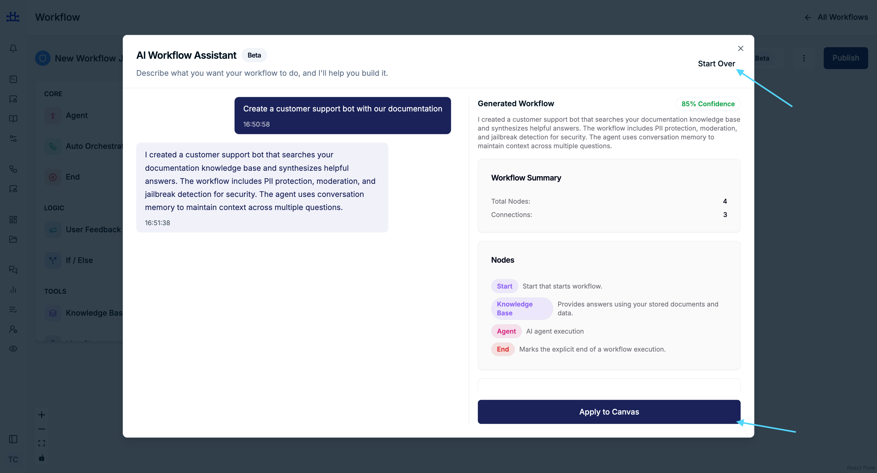 - Enter a prompt (example: Create a customer support bot with documentation).