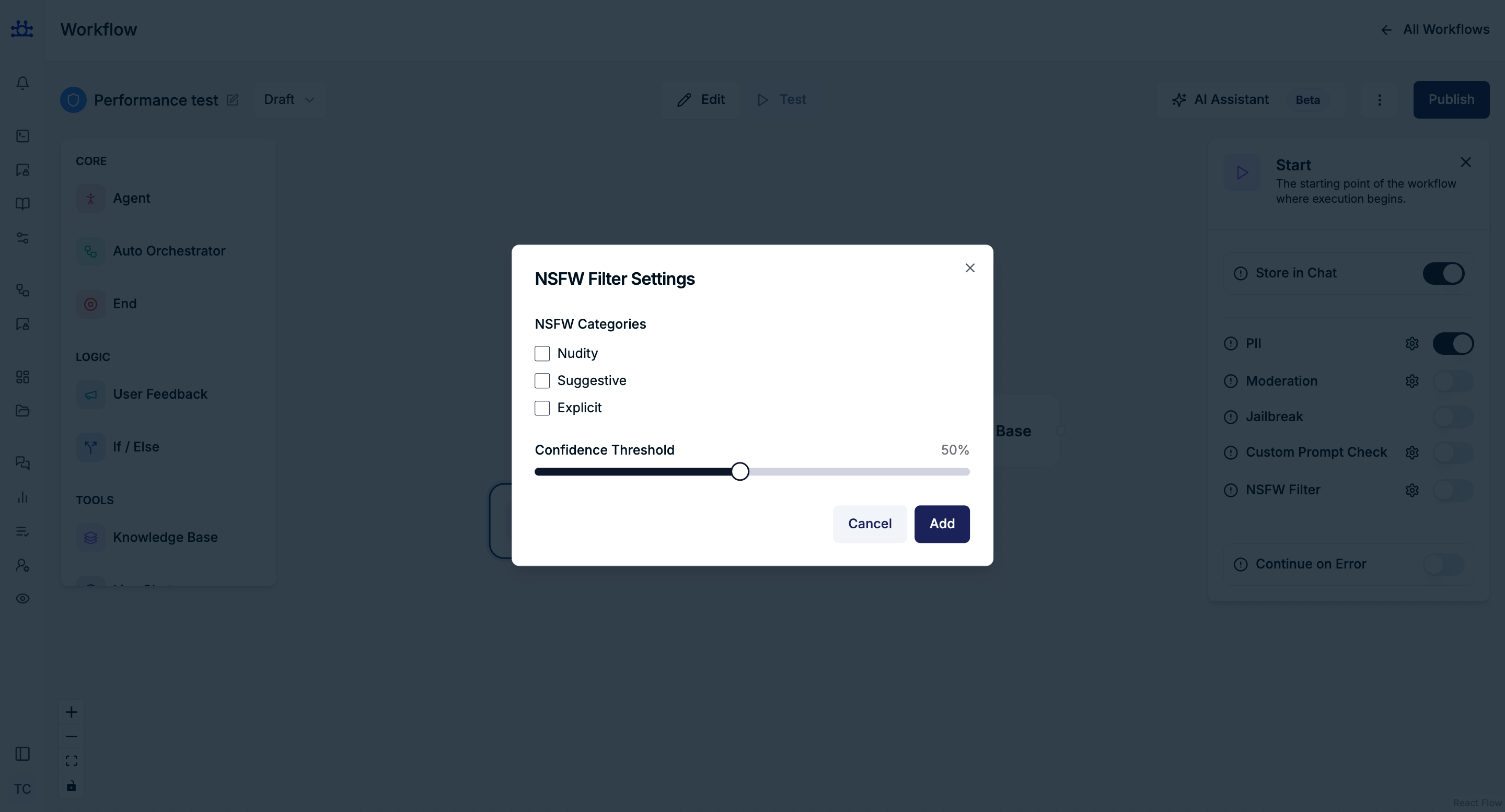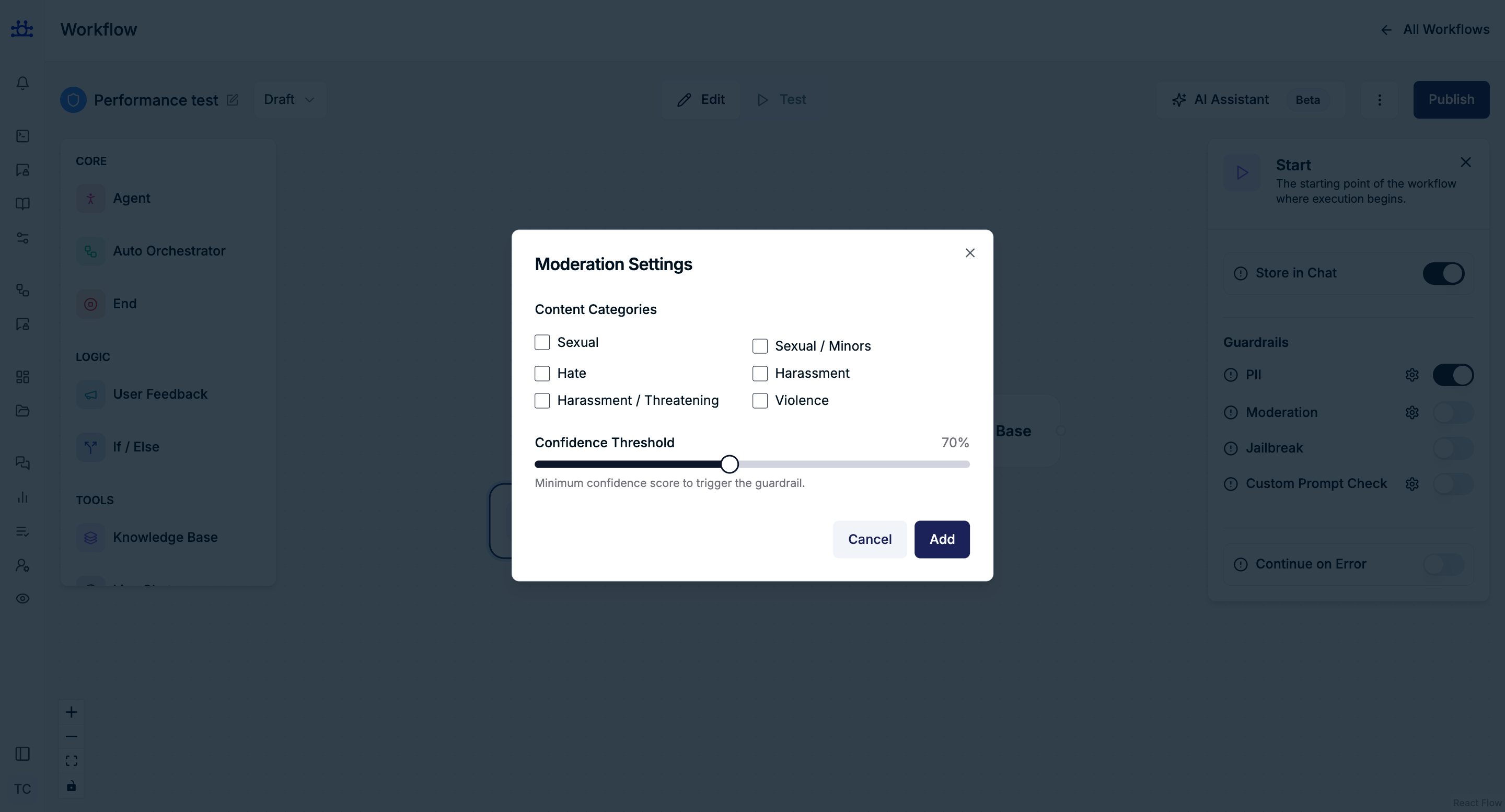 Each guardrail can be enabled independently and configured through its own settings modal.