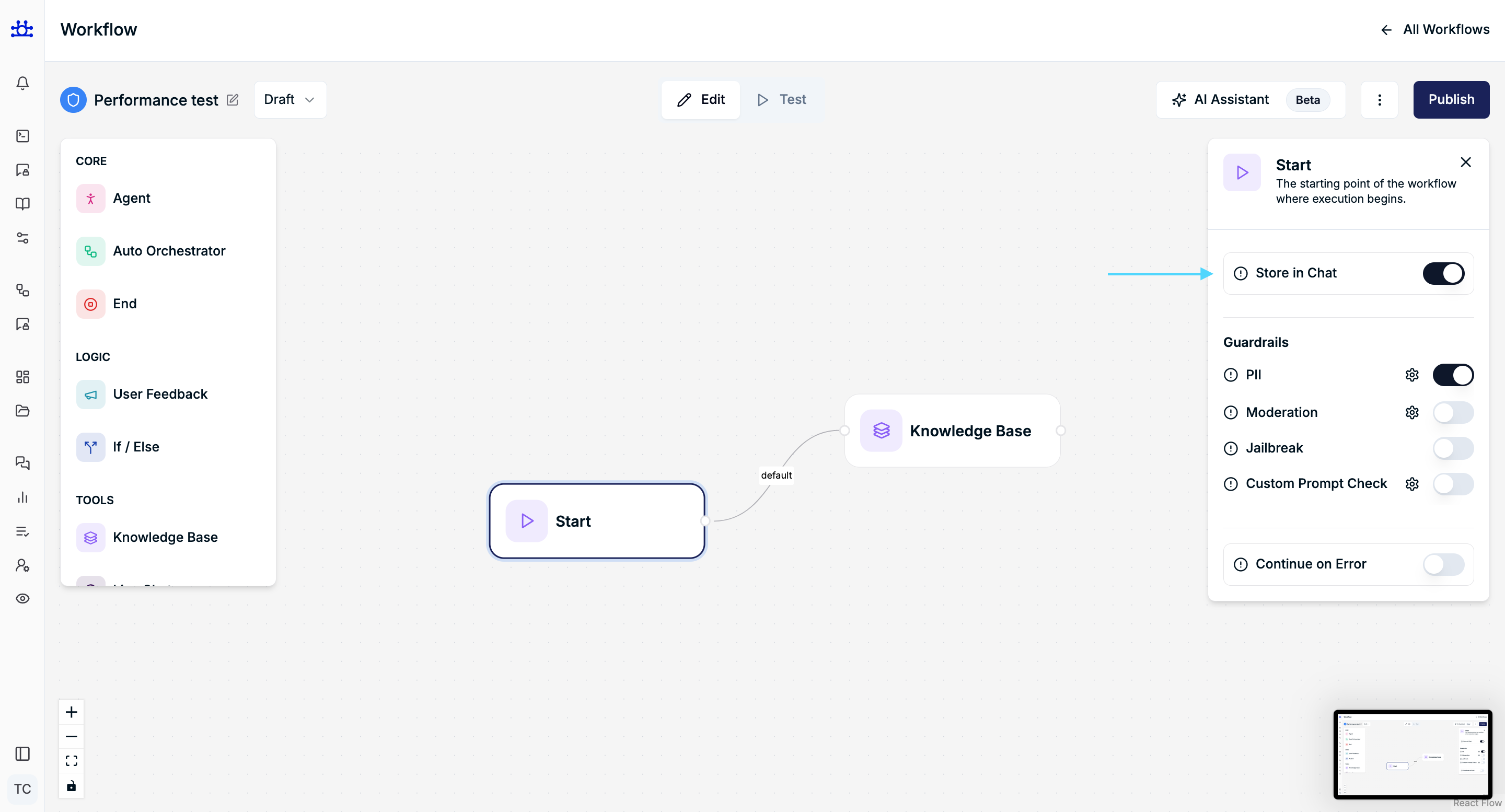 - When enabled, user input and workflow responses are saved and visible in chat conversations.