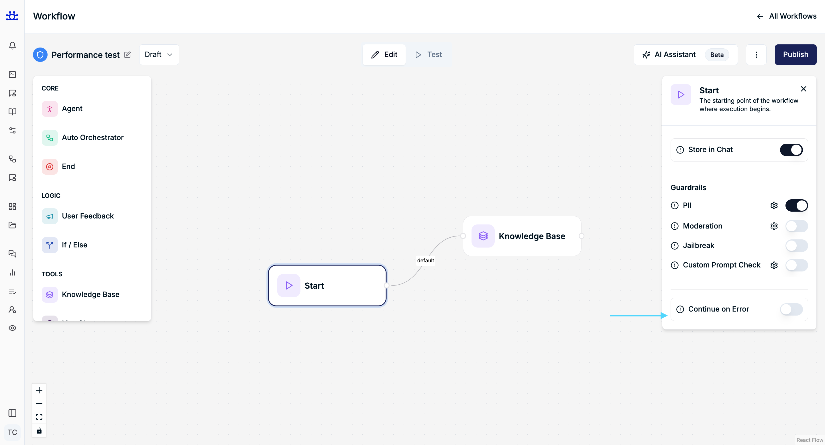 The Start node defines how a workflow begins and how incoming user messages are handled before reaching other nodes.