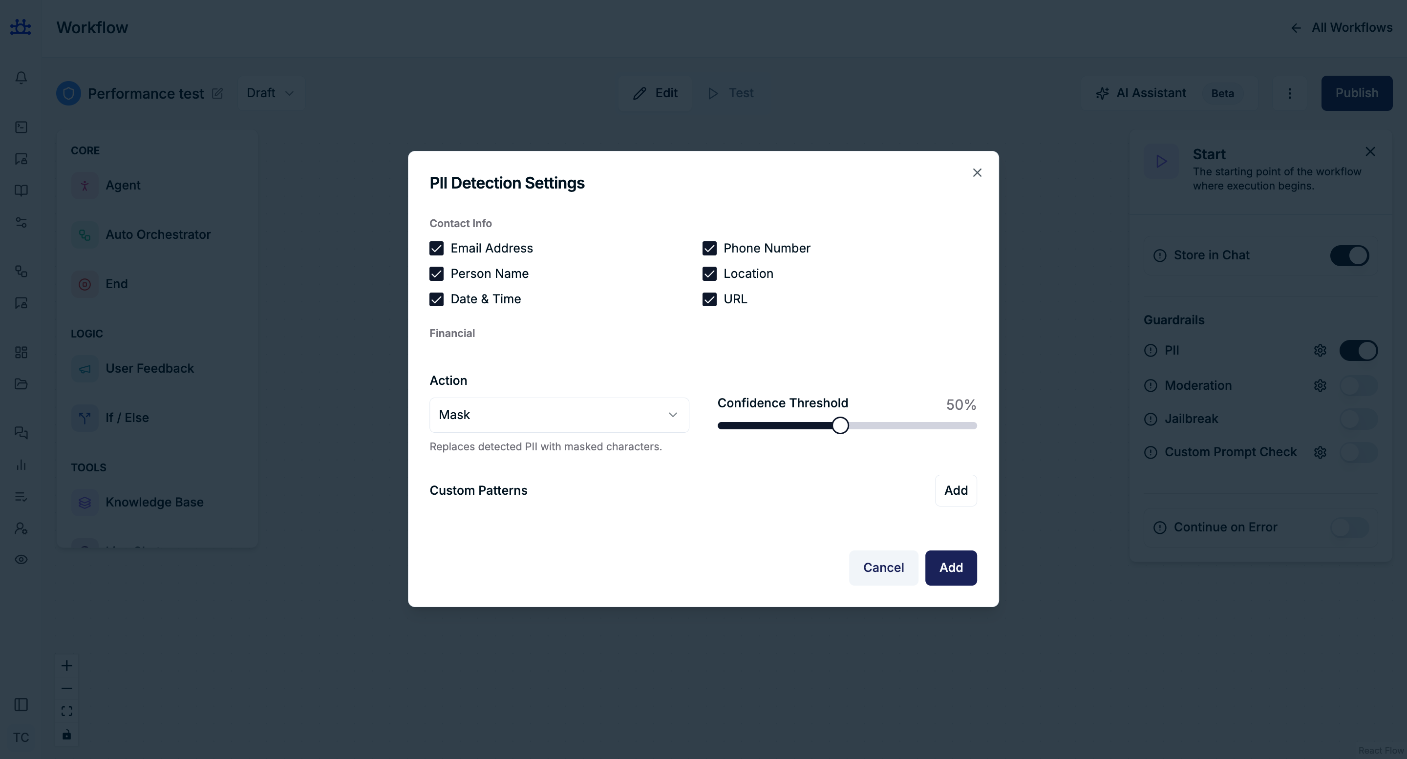 Prevents the message from being processed if PII is detected. The workflow stops and the user is notified that sensitive information cannot be accepted. - Skip Storage
