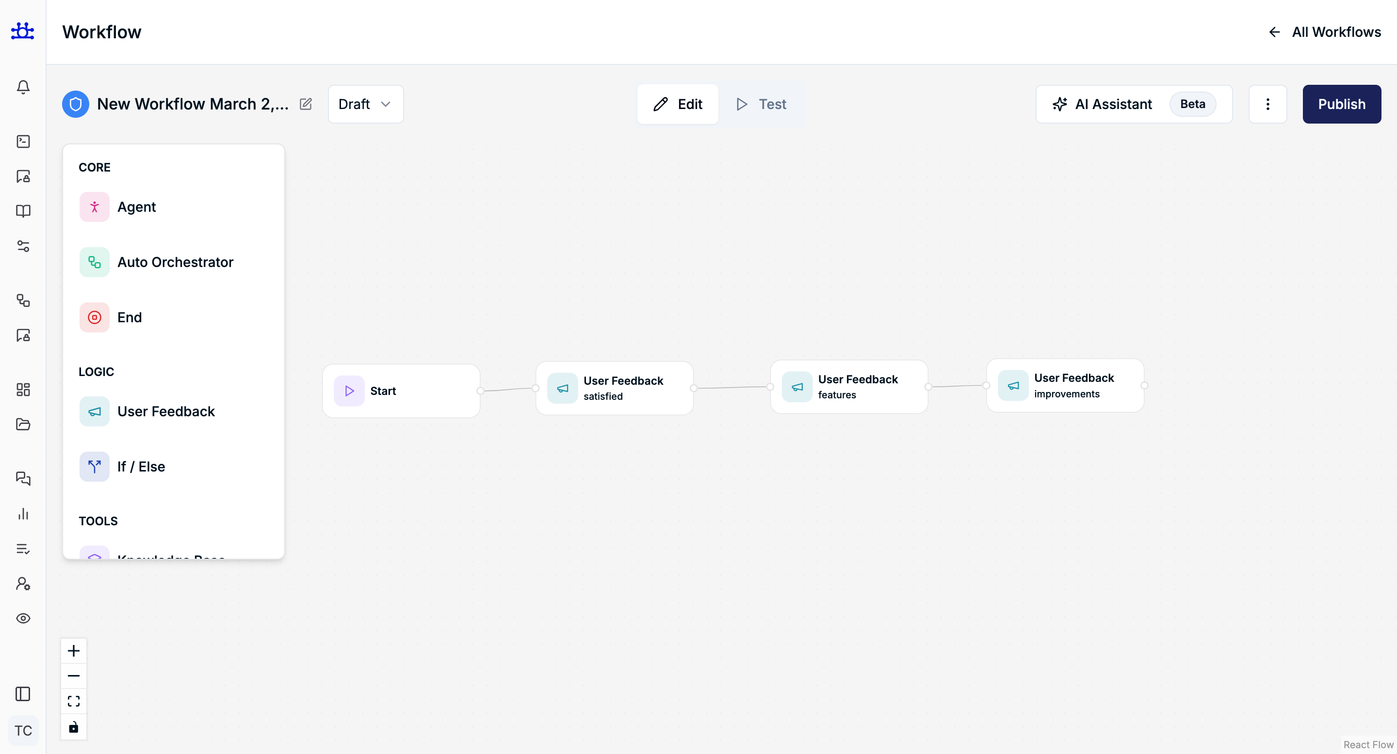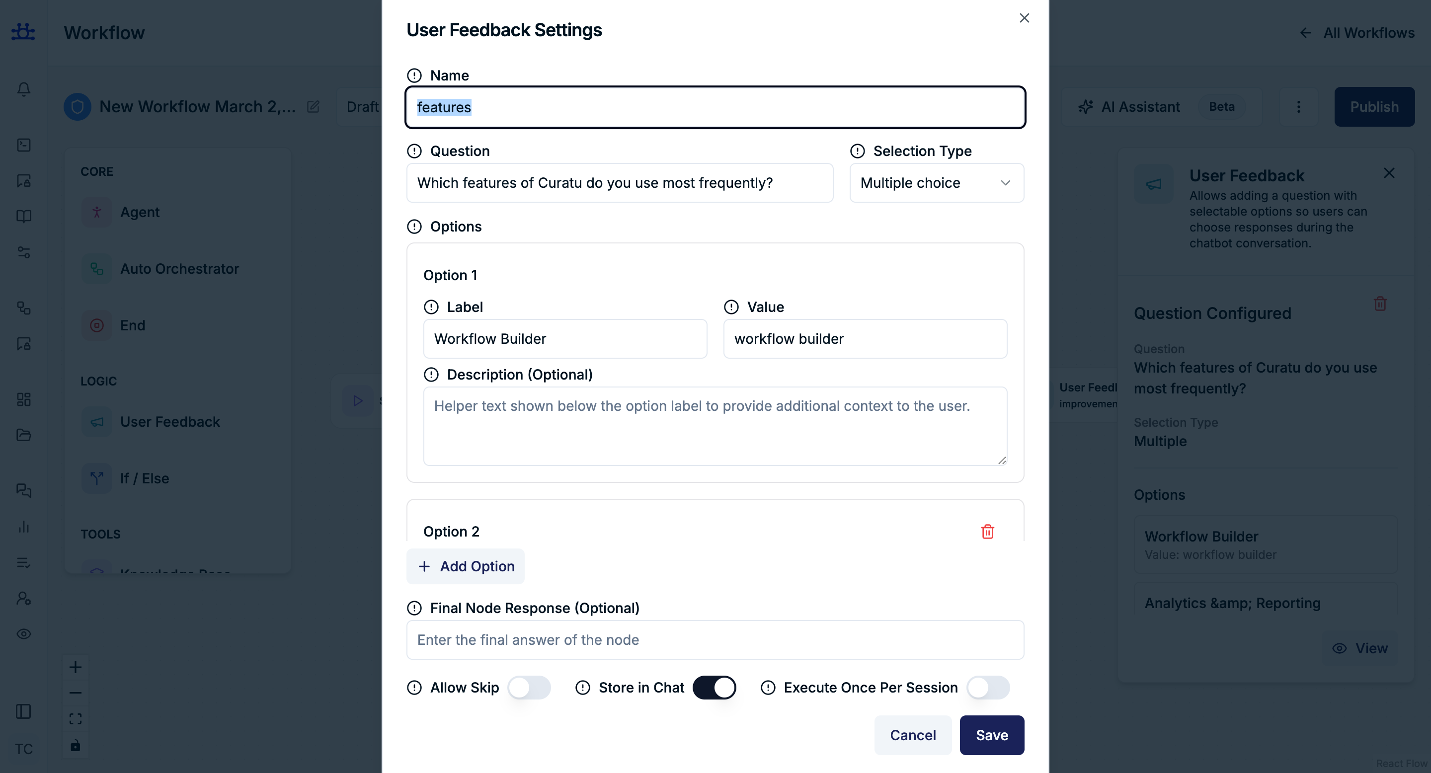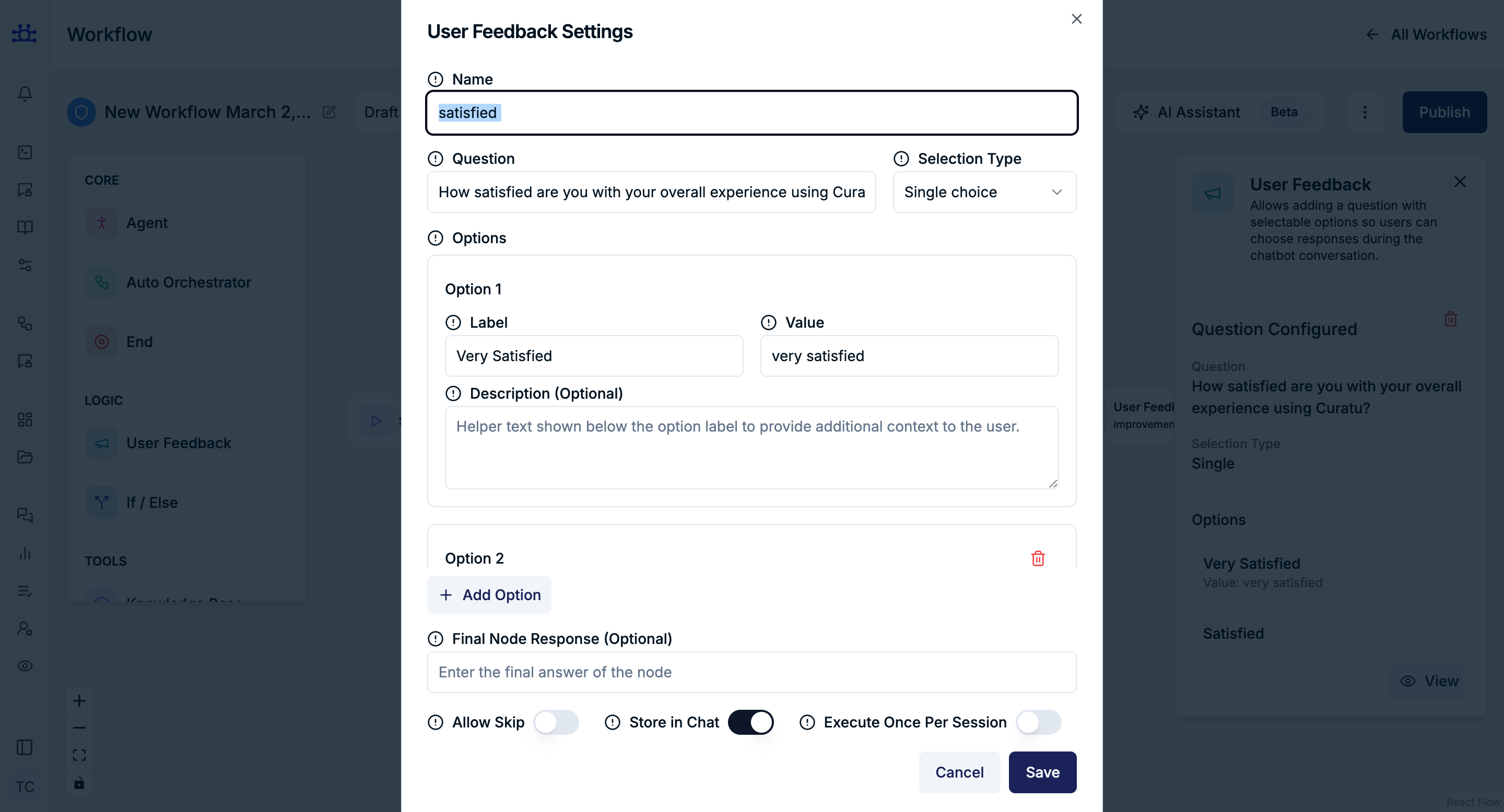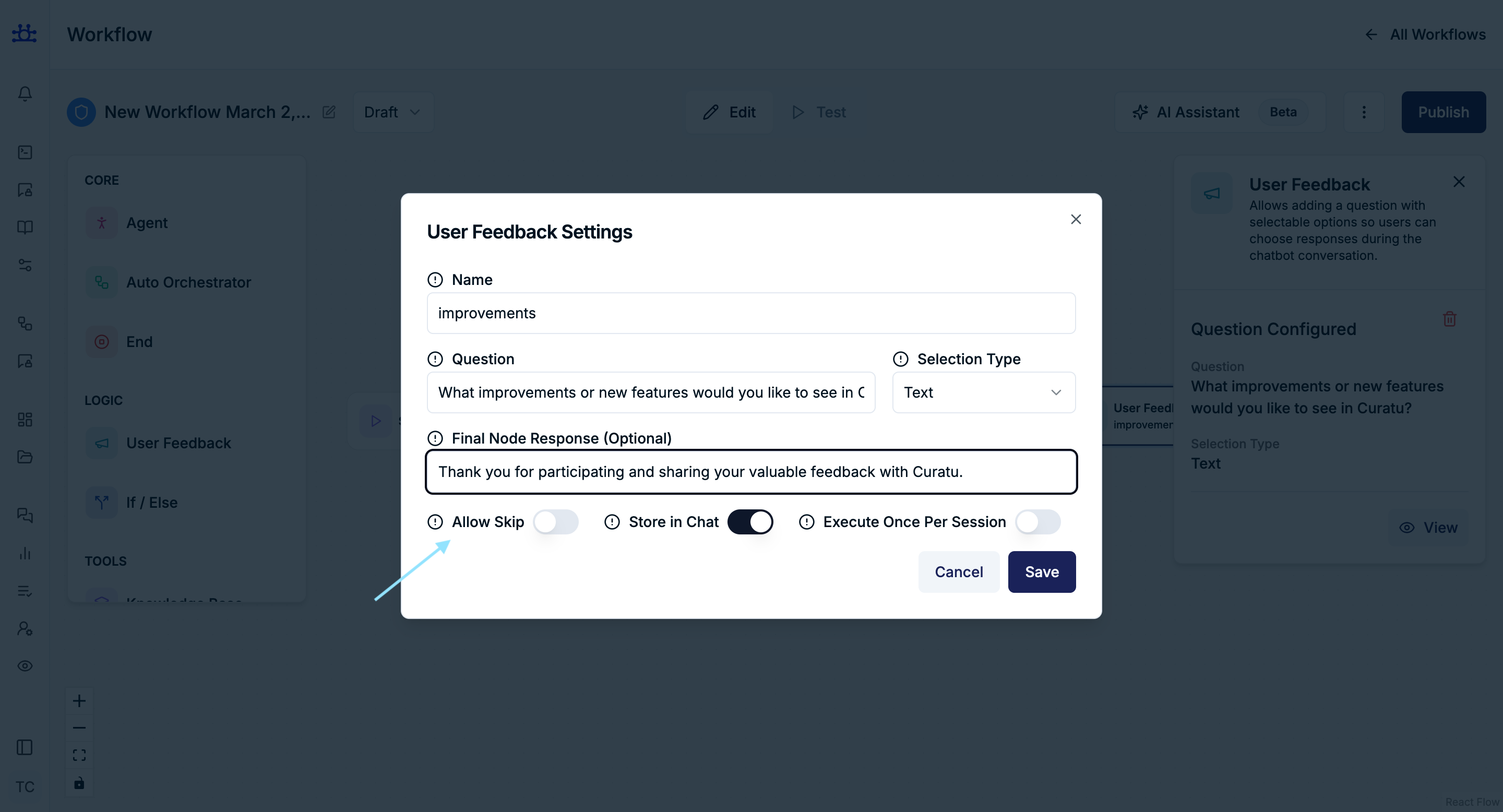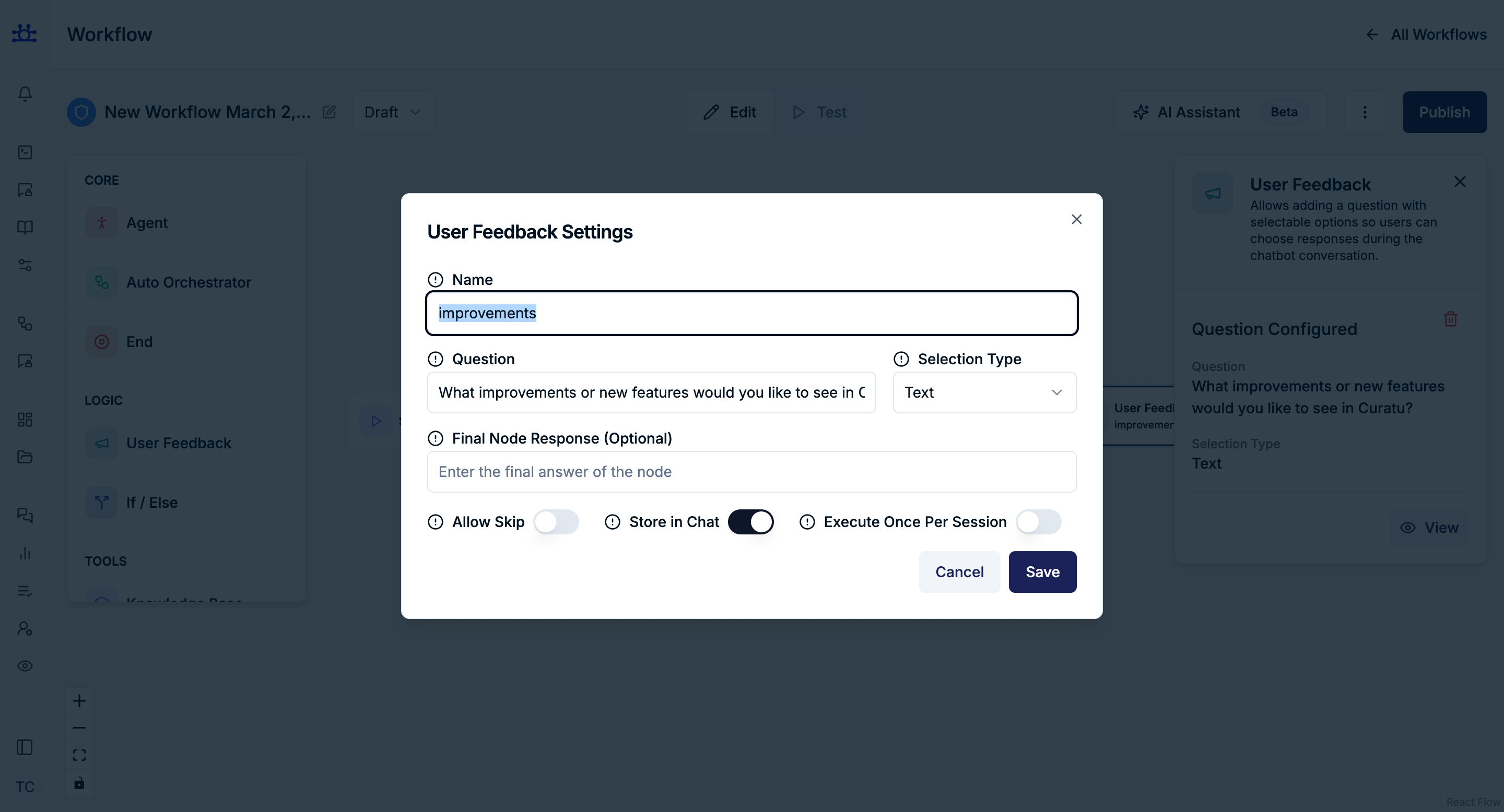 The User Feedback node is used to collect structured input from users during a workflow.